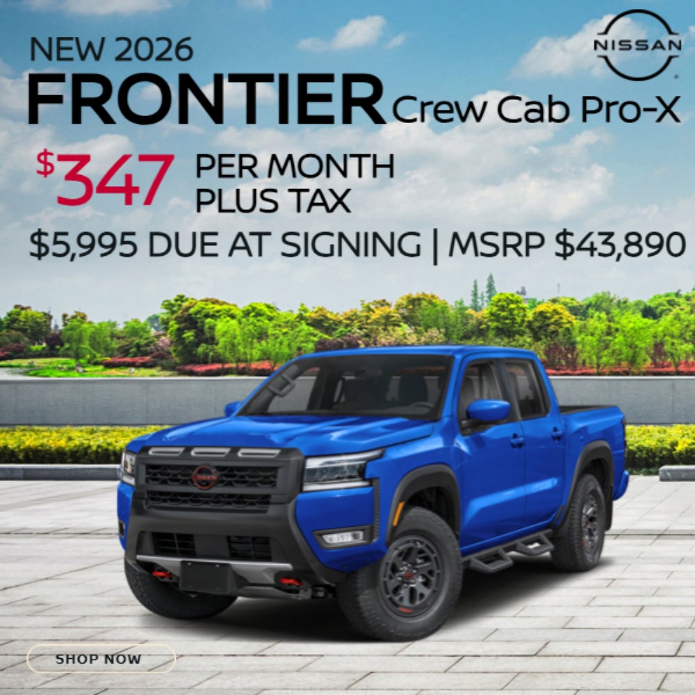 The 2026 Frontier PRO-X has arrived at Torre Nissan. Bold styling meets everyday versatility, making it the ideal truck for the Palm Springs lifestyle. Secure this low monthly payment today and drive home in the valley's favorite mid-size truck. [Vin# 1N6ED1EJ4TN603734. See dealer for full details. Ends 4/30/26.]