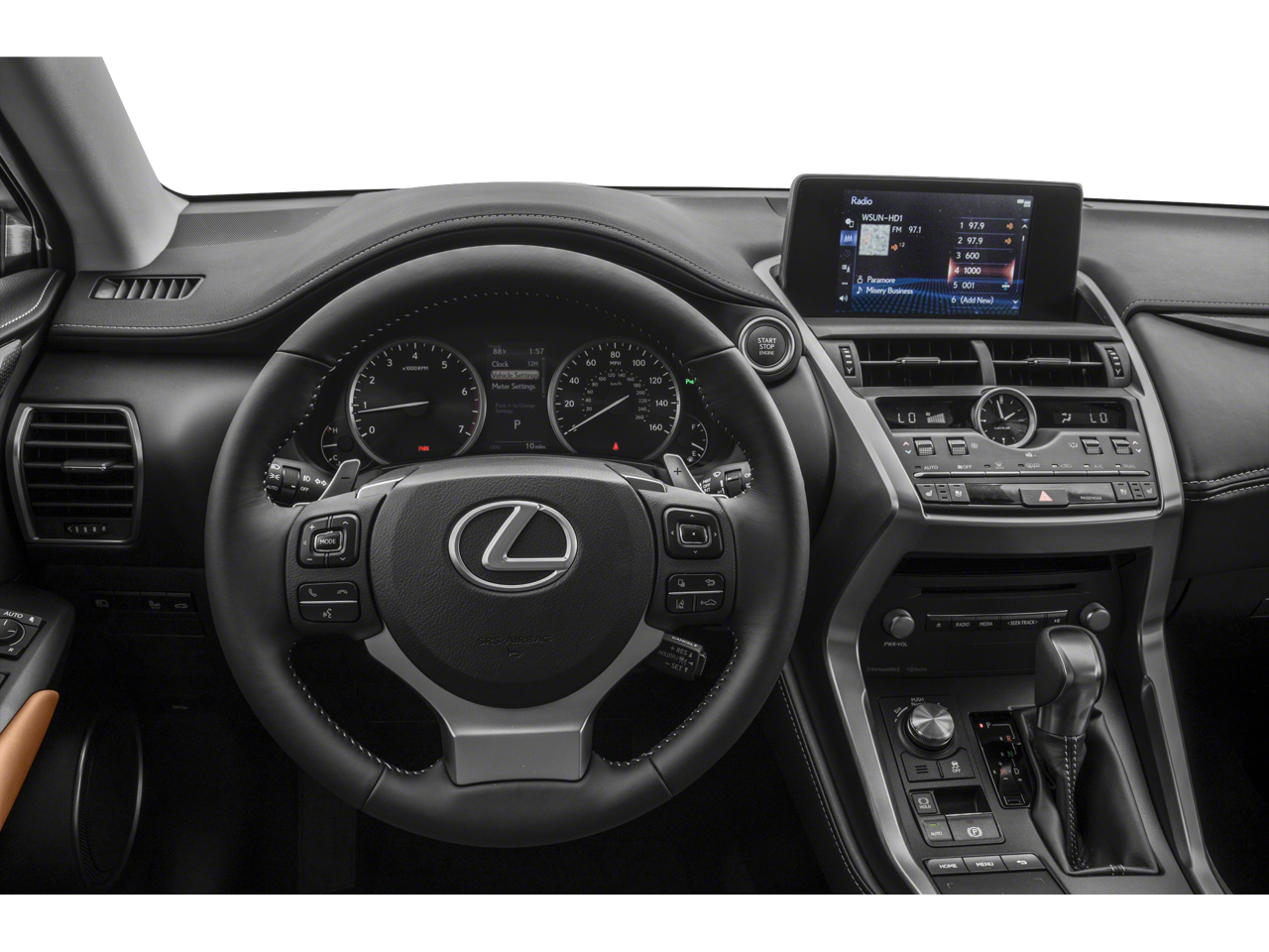 Black Line Edition (Electrochromic Heated Outside Mirrors, Electrochromic Inside Rear-View Mirror, Heated Front Seats, Heated Leather Steering Wheel w/Paddle, High Clearance Lamp, HomeLink Universal Transceiver, ICS Clearance & Back Sonar, Power Back Door w/Kick Sensor, Power Tilt & Slide Moonroof/Sunroof, Radio: 10-Speaker Lexus Premium Sound System, and Wireless Door Lock), NX 300 Base, 4D Sport Utility, 2.0L 16V DOHC, 6-Speed Automatic, FWD, Nebula Gray Pearl, Black/Bronze w/NuLuxe Seat Trim, 17 x 7 Alloy Wheels, Apple CarPlay/Android Auto, Emergency communication system: Lexus Enform Safety Connect, Exterior Parking Camera Rear, Four wheel independent suspension, Front anti-roll bar, Illuminated Door Sills, Low tire pressure warning, Power driver seat, Speed-sensing steering, Traction control, 4-Wheel Disc Brakes, 8 Speakers, ABS brakes, Air Conditioning, AM/FM radio: SiriusXM, Auto High-beam Headlights, Automatic temperature control, Axle Ratio: 3.888, Brake assist, Bumpers: body-color, CD player, Compass, Delay-off headlights, Door Edge Film by 3M, Driver door bin, Driver vanity mirror, Dual front impact airbags, Dual front side impact airbags, Electronic Stability Control, Front Bucket Seats, Front Center Armrest, Front dual zone A/C, Front fog lights, Front reading lights, Fully automatic headlights, Heated door mirrors, Illuminated entry, Knee airbag, Leather Shift Knob, Leather steering wheel, NuLuxe Seat Trim, Occupant sensing airbag, Outside temperature display, Overhead airbag, Overhead console, Panic alarm, Passenger door bin, Passenger vanity mirror, Power door mirrors, Power passenger seat, Power steering, Power windows, Radio data system, Rear anti-roll bar, Rear seat center armrest, Rear window defroster, Rear window wiper, Remote keyless entry, Roof rack: rails only, Security system, Speed control, Split folding rear seat, Spoiler, Steering wheel mounted audio controls, Tachometer, Telescoping steering wheel, Tilt steering wheel, Trip computer, Turn signal indicator mirrors, and Variably intermittent wipers.