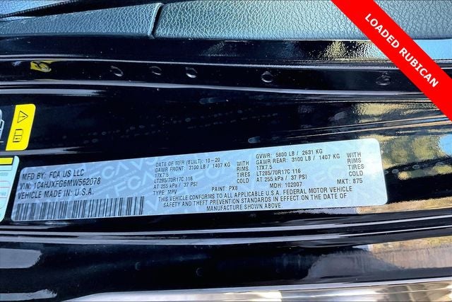 Advanced Safety Group (Advanced Brake Assist, Auto High Beam Headlamp Control, and Full Speed Forward Collision Warning Plus), LED Lighting Group (Daytime Running Lamps LED Accents, Front LED Fog Lamps, LED Premium Reflector Headlamps, and LED Taillamps), Quick Order Package 25R, Safety Group (Blind Spot & Cross Path Detection and ParkSense Rear Park Assist System), Steel Bumper Group (Steel Front Bumper and Steel Rear Bumper), 4-Wheel Disc Brakes, 4.10 Rear Axle Ratio, 8 Speakers, ABS brakes, Air Conditioning, Alloy wheels, Alpine Premium Audio System, AM/FM radio: SiriusXM, Apple CarPlay/Android Auto, Automatic temperature control, Aux Battery, Body Color 3-Piece Hard Top, Body Color Fender Flares, Brake assist, Compass, Delay-off headlights, Driver door bin, Driver vanity mirror, Dual front impact airbags, Dual front side impact airbags, Electronic Stability Control, Front anti-roll bar, Front Bucket Seats, Front Center Armrest w/Storage, Front dual zone A/C, Front fog lights, Front License Plate Bracket, Front reading lights, Fully automatic headlights, Garage door transmitter, Heated door mirrors, Illuminated entry, Integrated roll-over protection, Jeep Trail Rated Kit, Leather steering wheel, Low tire pressure warning, Manufacturer's Statement of Origin, MOPAR Hardtop Headliner, Non-Lock Fuel Cap w/o Discriminator, Occupant sensing airbag, Outside temperature display, Panic alarm, ParkView Rear Back-Up Camera, Passenger door bin, Passenger vanity mirror, Performance Suspension, Power door mirrors, Power steering, Power windows, Premium Cloth Low-Back Bucket Seats, Radio data system, Radio: Uconnect 4 w/7 Display, Rear anti-roll bar, Rear reading lights, Remote keyless entry, Remote Proximity Keyless Entry, Remote Start System, Security system, Speed control, Split folding rear seat, Steering wheel mounted audio controls, Stop-Start Dual Battery System, Tachometer, Telescoping steering wheel, Tilt steering wheel, Traction control, Trip computer, Variably intermittent wipers, Voltmeter, and Wheels: 17 x 7.5 Machined w/Black Pockets.