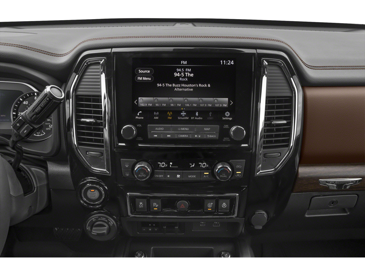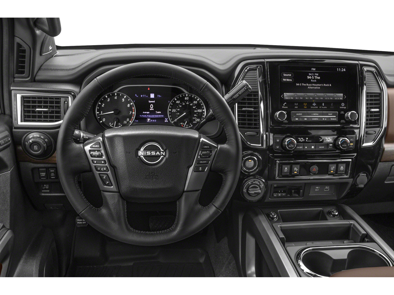 - Radio: NissanConnect w/Navigation -inc: AM/FM/SiriusXM, Fender premium audio system w/12 speakers (including amp, underseat subwoofer, center speaker and front/rear tweeters), wireless Apple CarPlay, Android Auto, 9" touchscreen display, Wi-Fi hotspot, Nissan door-to door navigation w/3D building graphics and satellite imagery, connected navigation features including online POI search, over-the-air map updates, and online premium traffic information, SiriusXM Traffic, SiriusXM Travel Link (weather, fuel prices, movie listings, stock info, sports and parking), TomTom weather, 2 illuminated USB connections (1 type A, 1 type C), Bluetooth® hands-free phone system, streaming audio via Bluetooth®, hands-free text messaging assistant and HD radio