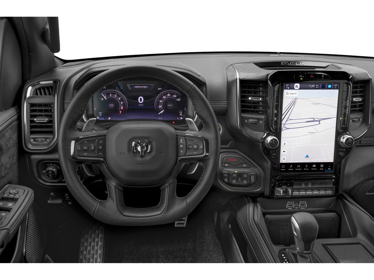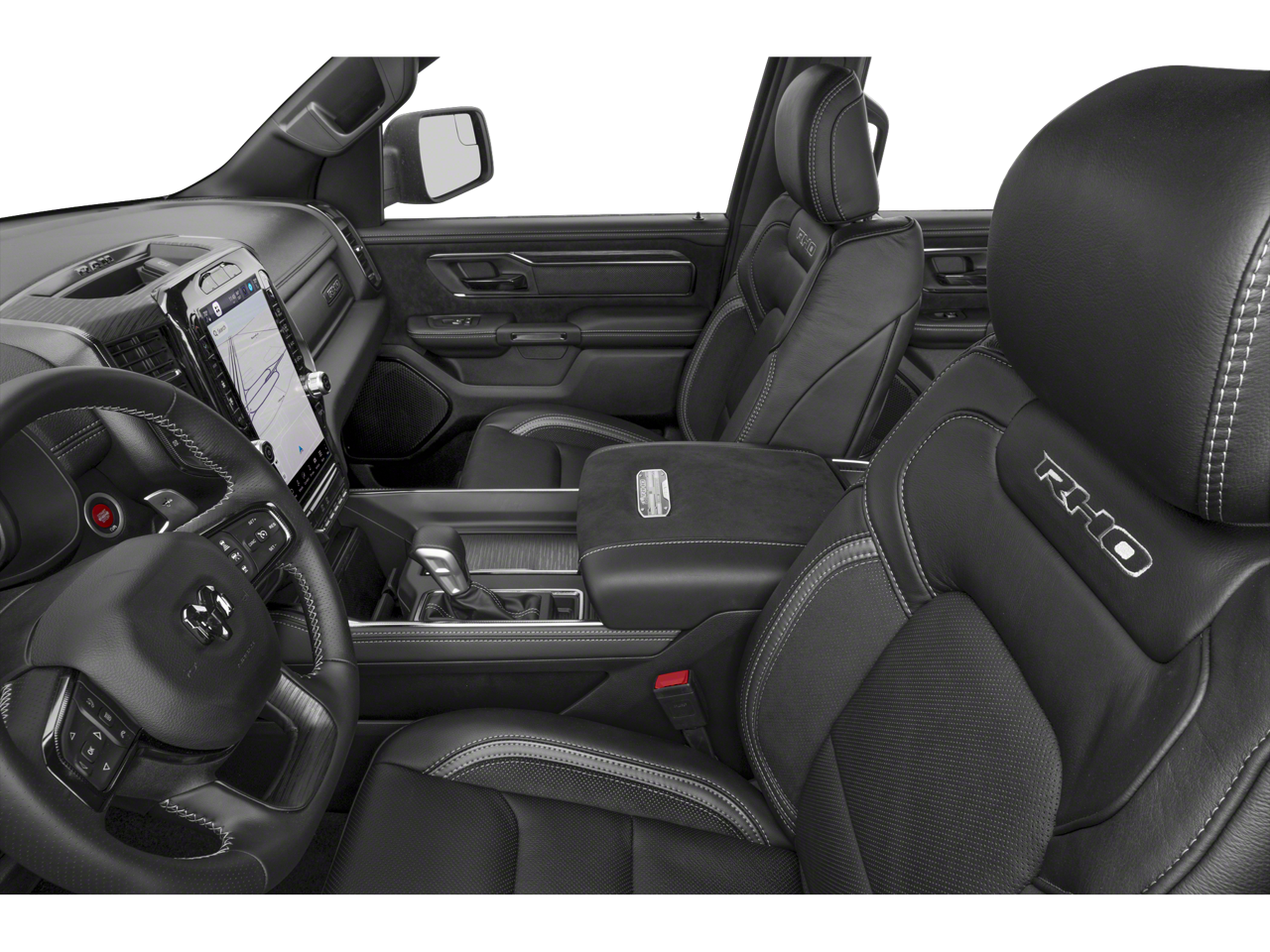Bed Utility Group (Exterior 115V AC Outlet, MOPAR 4 Adjustable Cargo Tie-Down Hooks, MOPAR Deployable Bed Step, and MOPAR Spray In Bedliner), RHO Level 1 Equipment Group (12-Way/1-Way Trailer Connector, 14.4 Touchscreen Display, 240 Amp Alternator, 4G LTE Wi-Fi Hot Spot, Apple CarPlay, Connected Travel & Traffic Services, Connectivity - US/Canada, Driver Power Seat Back Massage, Driver Seat Memory, Driver/Passenger Wrapped Assist Handles, Drowsy Driver Detection, Dual Wireless Charging Pad, Evasive Steer Assist, Exterior Mirrors w/Memory, Front Passenger Interactive Display, Front Passenger Power Seat Back Massage, Full Length Premium Upgraded Floor Console, Google Android Auto, GPS Navigation, Hands-Free Active Driving Assist System, harman/kardon 19 Speaker Premium Sound, HD Radio, Heads-Up Display, Heated Second Row Seats, Integrated Voice Command w/Bluetooth®, Intersection Collision Assist System, Leather/Carbon Flat-Bottom Steering Wheel, LED CHMSL Lamp, Luxury Front Door Trim Panel, Power Adjustable Pedals w/Memory, Power Tailgate, Premium Wrapped I/P Bezel, Radio: Uconnect 5 Nav w/14.4 Display, Radio/Driver Seat/Mirrors/Pedals Memory, Rain Sensitive Windshield Wipers, Real Carbon Fiber Interior Accents, Rear 60/40 Folding Split Recline Seat, Smartphone As A Key Capable, Surround View Camera System, Traffic Sign Recognition, USB Host Flip, Ventilated Front Seats, and Ventilated Rear Seats), Quick Order Package 22Y RHO, Navigation System, 10 Speakers, 3.92 Rear Axle Ratio, 4-Wheel Disc Brakes, ABS brakes, Adaptive suspension, Adjustable pedals, Air Conditioning, Alloy wheels, AM/FM radio: SiriusXM with 360L, Apple CarPlay/Android Auto, Auto High-beam Headlights, Auto Power-Folding Mirrors, Auto-dimming door mirrors, Auto-Dimming Exterior Driver Mirror, Auto-dimming Rear-View mirror, Automatic temperature control, Brake assist, Compass, Delay-off headlights, Dome Dual LED Reading Lamp, Driver door bin, Driver vanity mirror, Dual front impact airbags, Dual front side impact airbags, Dual-Pane Panoramic Sunroof, Electronic Stability Control, Exterior Mirrors Courtesy Lamps, Exterior Mirrors w/Heating Element, Exterior Mirrors w/Supplemental Signals, Flareside Box, Front anti-roll bar, Front Bucket Seats, Front Center Armrest w/Storage, Front dual zone A/C, Front fog lights, Front License